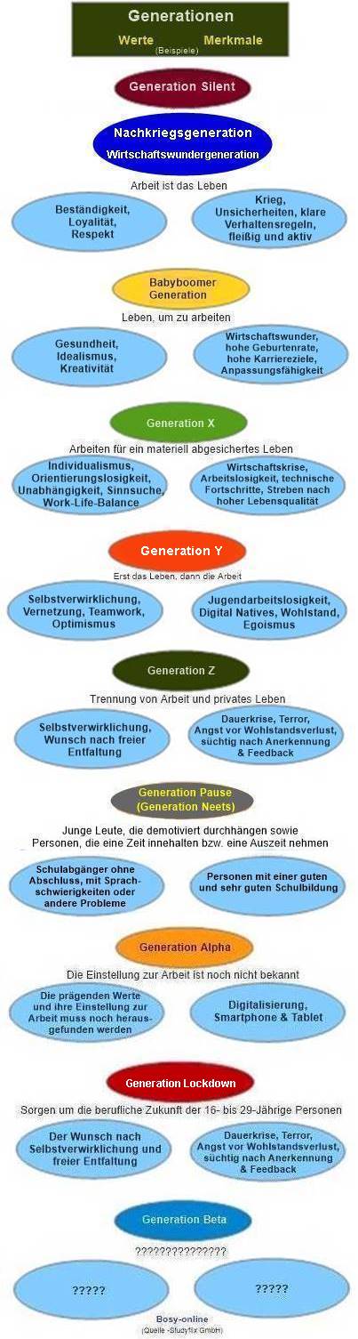 Das Wissen über die Skills (Fertigkeit, Fähigkeit, Können, Verhalten) und Kompetenzen der Generationen (Silent, Babyboomer, Gen X-Y-Z-α-Lockdown-β) sind wichtige Faktoren bei der Einstellung und Beschäftigung von Arbeits- und Fachkräften. Die Generationen grenzen sich gewollt oder ungewollt von der Vorgänger- bzw. Nachfolgegeneration ab. Über das "warum" sind sich die Fachleute immer noch nicht einig.