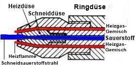 (Vorwärmflamme, Heizflamme) örtlich auf die Entzündungstemperatur (ca. 1.150 °C) erwärmt und im reinen Sauerstoffstrahl