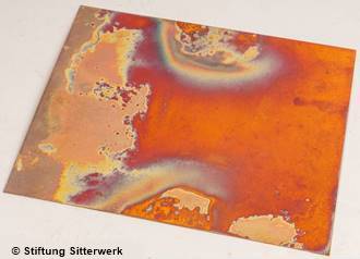 Auf Kupfer entwickelt sich mit steigender Temperatur eine Anlassfarbenreihe von Orange über Rosenrot, Violett, Stahlweiss, Messinggelb, Fleischrot bis Grün mit vielen Zwischentönen. |