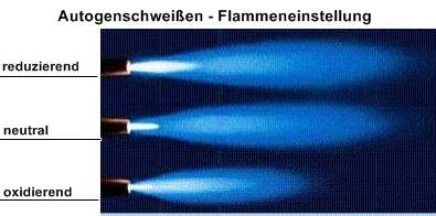 Die Schweißflamme wird am Handstück (Griffstück) eingestellt, wobei Acetylen und Sauerstoff im Verhältnis 1:1 bis 1,2:1 gemischt werden. Diese Flamme nennt man neutrale Flamme. Sie kann "hart" oder "weich" eingestellt sein, je nach der Geschwindigkeit, mit der das Gasgemisch aus der Brennermündung strömt. Die Einstellung ist von der Materialdicke abhängig. Die Flamme wirkt bei diesem Mischverhältnis reduzierend, d. h. dass kein Luftsauerstoff mit dem Werkstück eine Verbindung eingehen, und somit eine Oxidschicht bilden kann, die eine gute Verschweißung verhindern würde. Das Acetylen-Sauerstoffgemisch verbrennt in zwei Stufen. In der ersten Stufe findet an der Brennerspitze (Schweißeinsatz, Schweißbrenner) zunächst eine unvollständige Verbrennung statt. Die dadurch entstandenen Gase Kohlenmonoxid und Wasserstoff brauchen zu ihrer restlosen Verbrennung weiteren Sauerstoff, welchen sie aus der umgebenden Luft holen.