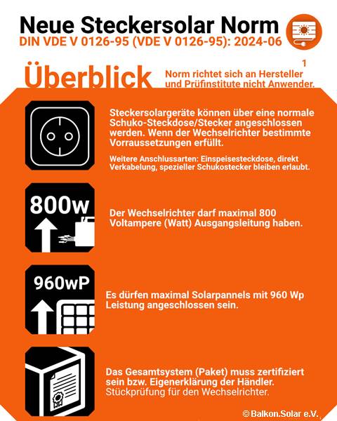 Im Februar 2017 trat die DIN VDE 0100-551 "Auswahl und Errichtung elektrischer Betriebsmittel – Andere Betriebsmittel – Abschnitt 551: Niederspannungsstromerzeugungseinrichtungen" in Kraft. Dort sind die Anforderungen für die Einrichtung von Kleinstanlagen zur Stromerzeugung geregelt. Daraus ergibt sich, dass Solarmodule (Komplettpakete) für die Steckdose legal sind. Dies gilt Natürlich müssen sich die Hersteller und die Betreiber an die gesetzlichen Vorgaben halten. Beim Netzbetreiber muss die Anlage angemeldet werden.