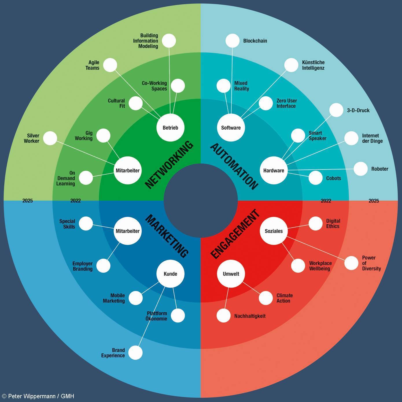 Insgesamt sind 35 Themen im Trendradar berücksichtigt, die den vier Handlungsfeldern "Arbeit & Kultur", "Digitalisierung & Technologie", "Kommunikation & Betrieb" sowie "Werte und Nachhaltigkeit" zugeordnet sind. Das Hauptaugenmerk sollten die Betriebe dabei auf jene Trends legen, die schon jetzt unmittelbaren Einfluss auf ihre Branche haben und kurz vor der massenhaften Verbreitung stehen. Wer diese ignoriert, könnte in den nächsten Jahren an Wettbewerbsfähigkeit in seiner Branche verlieren.
