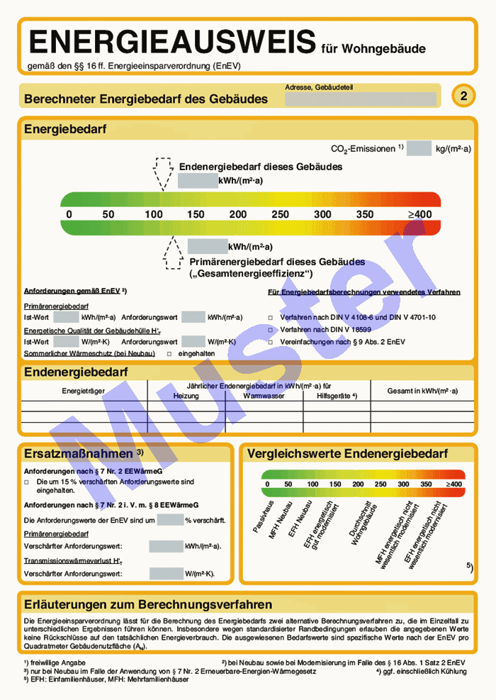 | Der Bedarfsausweis enthält Angaben zum Energiebedarf von Wohngebäuden, der auf der Grundlage einer technischen Analyse der Bausubstanz und der Heizungsanlage unter Normbedingungen ermittelt wird. Dabei wird das individuelle Nutzerverhalten nicht berücksichtigt. |
