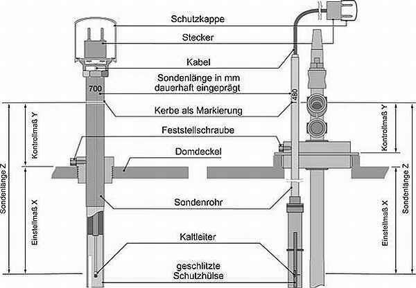 in das Heizöl, bis der Füllstand durch den Heizölverbrauch im Jahresverlauf wieder gesunken ist. Die Anhaftungen trocknen an und so können sich über mehrere Jahre hinweg Ablagerungen an Kaltleiter und Schutzhülse